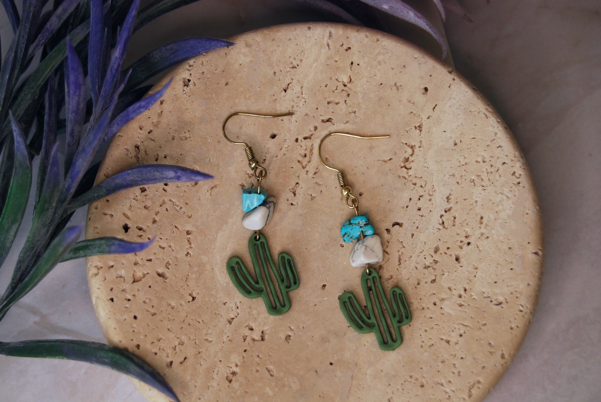 Natural polished howlite and turquoise stones with a cactus charm. Cactus charm is flat on the back, but bumpily textured on the front!