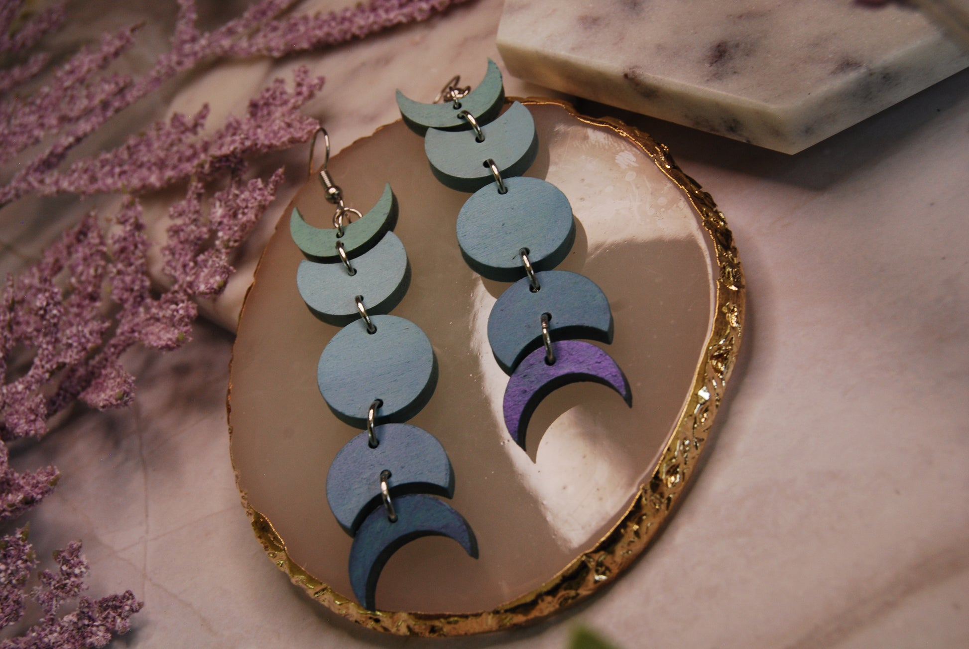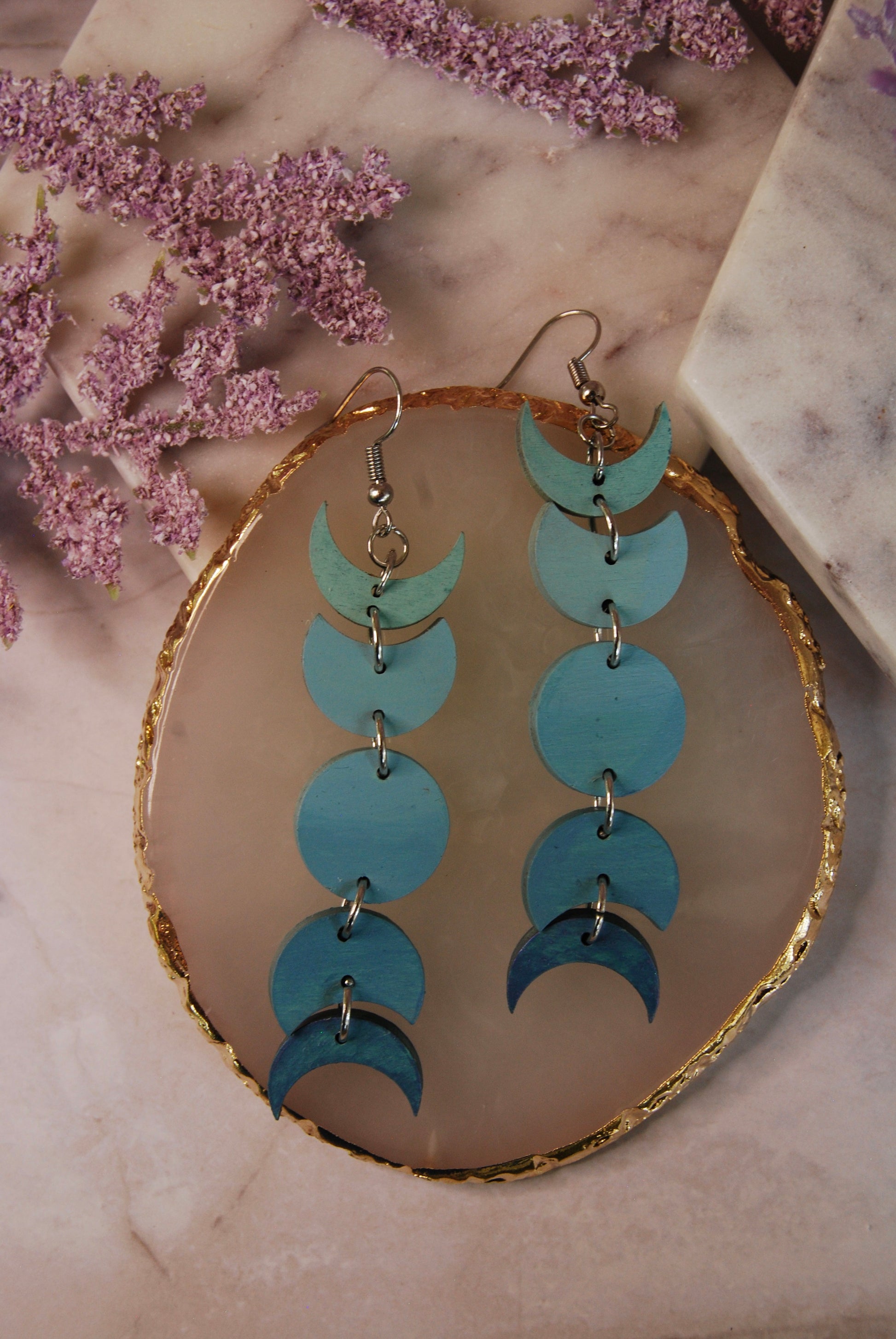 These hand painted, wooden earrings are slightly color shifting. In certain light or at certain angles the darker teal looks purple!